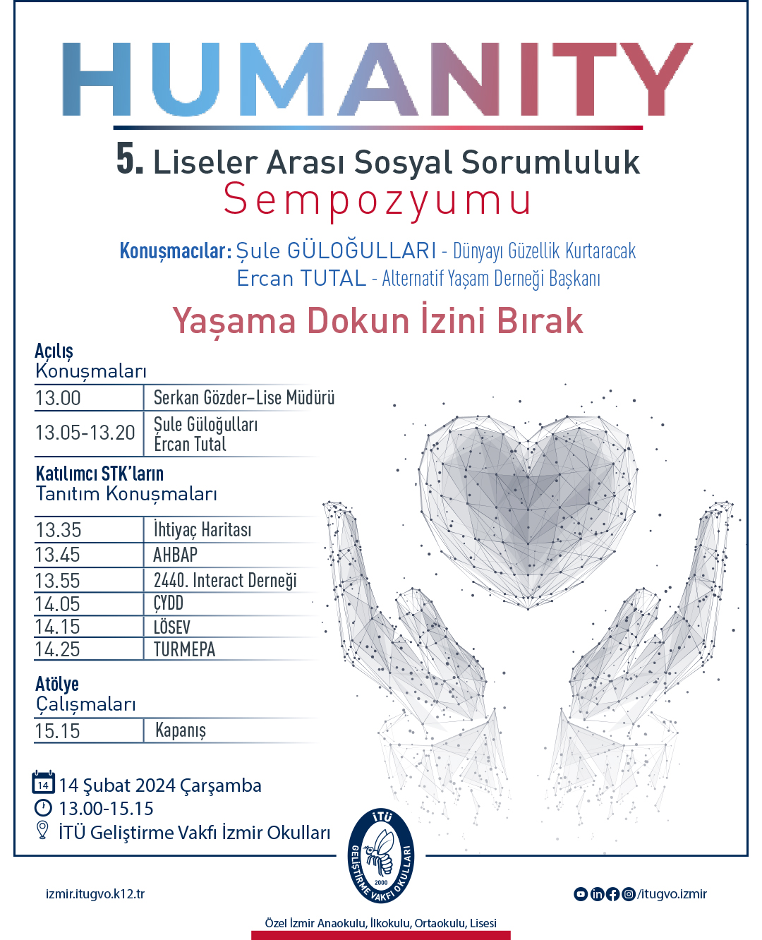 İTÜ Geliştirme Vakfı Özel İzmir Anadolu Lisesi öğrencilerimizin sosyal farkındalık projeleri geliştirmelerine destek olabilmek amacıyla düzenlediği “Humanity Sosyal Sorumluluk Çalışmaları Sempozyumu” 14 Şubat Çarşamba günü sivil toplum örgütlerinin katılımı ile gerçekleştirilecek.